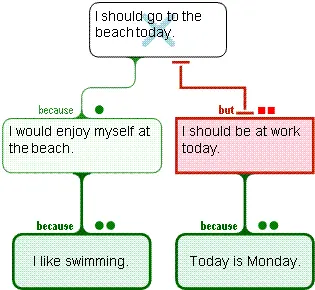The evaluation icons or dots are a useful convention to ascertain how well the claim above is supported or opposed. You can think of them as beads, and count them to ascertain the overall weight of each case. Strong reasons have two circles and strong objections have two squares. Weak reasons have one filled in circle and objections one filled in square. Reasons with nil support have one unfilled circle and objections with nil support have one unfilled square. Don't take the 'bead' analogy too seriously. They aren't strictly numerical: two (very) strong reasons (four circles) might weigh more than five (fairly) weak objections (5 squares).