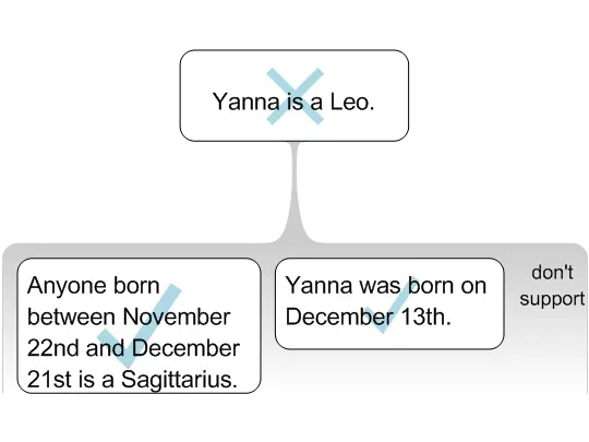 This was meant to be a reason to think that Yanna is a Leo. But as you can see, even though the premises are true, the reason does not support the contention. Even though it appears to be relevant to the claim it's meant to support, it in fact supports a very different conclusion - that Yanna is a Sagittarius, not a Leo. Not only does it not support it, it gives us enough information to know that the contention is false! In other words, it's in fact an objection!