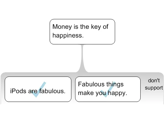 - Judge the strength or validity of the reason to the claim above. This means that even if the claims are true, do they give you good reason to believe the claim above? This may seem obvious, however sometimes we have true claims that have no real connection to each other, for instance the reason below has true claims but has no clear relationship to the contention. (This is because one of the key terms "money" is missing in the reason).
