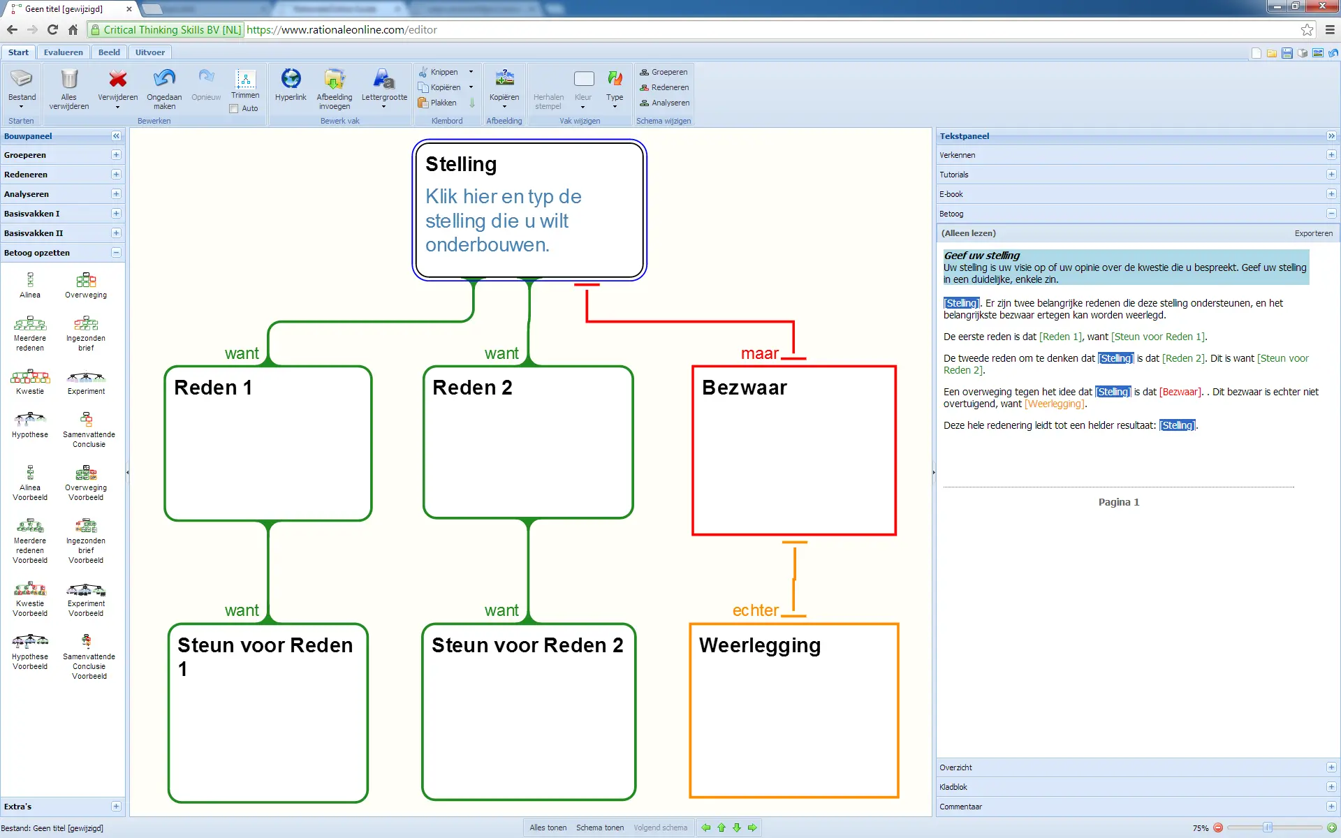 Stap 3 - Volg de instructies in de sjabloon om jouw betoog te maken. Jouw betoog wordt gegenereerd in het Betoog Voorbeeld scherm. NB: Vul alle vakken in. Als je vakken toevoegt of verwijdert in een betoogsjabloon herkent Rationale dit niet meer als een sjabloon.