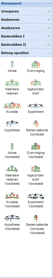 In het paneel Betoog Opzetten vind je een aantal sjablonen bijvoorbeeld voor een ingezonden brief, een onderzoek en een conclusie. Sleep het gewenste sjabloon naar de werkruimte.