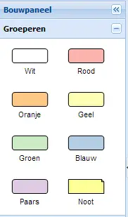 Ja, u kunt kleurvakken in het deelvenster Groeperen kiezen.Sleep het gekleurde vak dat u wilt gebruiken naar uw werkblad. Beschikbare kleuren zijn rood, oranje, geel, groen, blauw en paars.