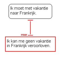 ![]() | Een reden om niet naar Frankrijk te gaan op vakantie is dat ik het niet kan betalen! Een reden ergens tegen is een bezwaar ertegen: daarom komt deze in een bezwaarvak (rood) onder de stelling te staan. |