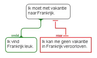 | Mijn reden om voor Frankrijk te kiezen is dat ik denk dat ik Frankrijk waarschijnlijk leuk zal vinden. Ik zet mijn reden in een (groen) redenvak onder de stelling. Daarmee heb ik een schema van een fundamentele, enkelvoudige redenering opgezet! |