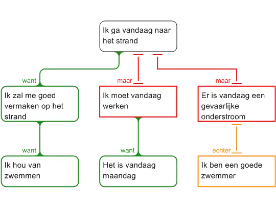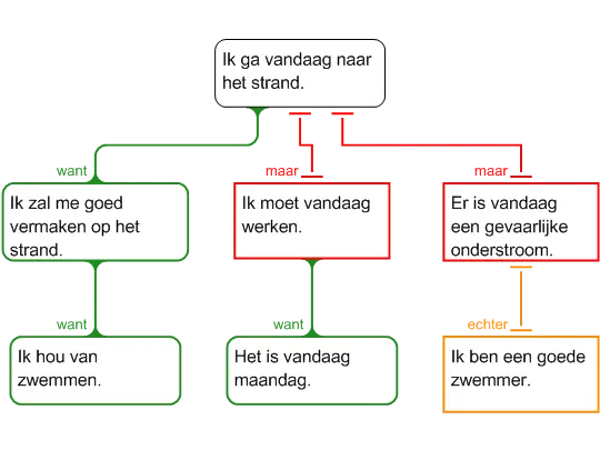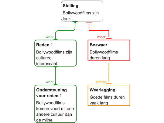 Niet per se! Doorgaans zal iemand die een stelling wilt ondersteunen daarvoor niet alleen redenen aandragen, maar ook weerleggingen voor de kant die de redenering tegenspreekt. In dat geval wordt de weerlegging in oranje weergegeven, omdat het een bezwaar is tegen een bezwaar. Als iemand het oneens is met een stelling, zal deze bezwaren uiten maar tevens redenen aandragen om deze bezwaren te ondersteunen. Ook in dat geval is er dus een mengeling van rode en groene vakken.