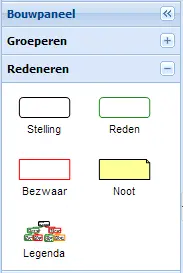Het maken van Redeneerschema’s is een eenvoudige manier om redeneringen over een bepaalde kwestie in kaart te brengen. Het witte vak is de stelling, groene vakken zijn redenenen, rode vakken zijn bezwaren en oranje vakken zijn weerleggingen (deze worden automatisch gemaakt als er sprake is van een bezwaar tegen een bezwaar).