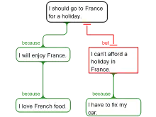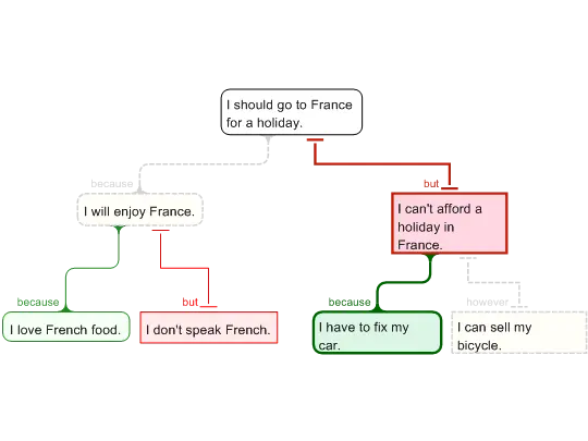 The fact that I have to fix my car is a strong reason to believe that I can't afford a holiday in France, since I know that fixing the car will be quite expensive and I'm not very rich! (Rationale represents a strong reason as dark green, with two optional green dots next to it.)