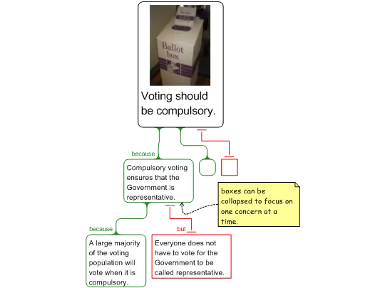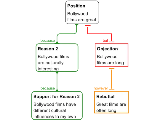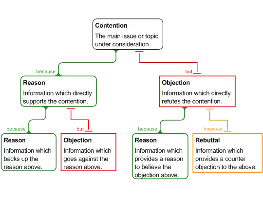 Reasoning maps lay out an argument so that everyone is clear what is going on! The white box is the contention, green boxes are reasons, red boxes are objections and orange boxes are rebuttals (these are created automatically when there is an objection to an objection).