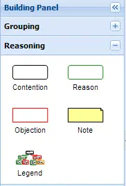 The reasoning panel on the left side of the workspace contains all you need to build reasoning maps. You can drag and drop reasoning boxes, templates, a quick start template, an example and a legend.