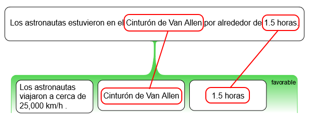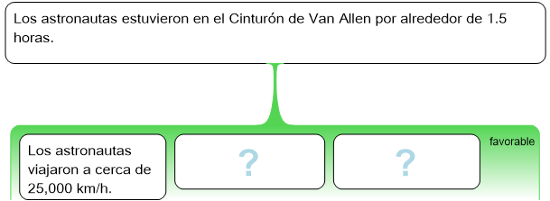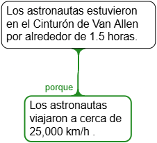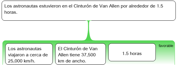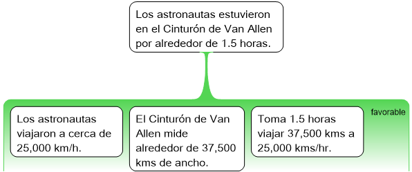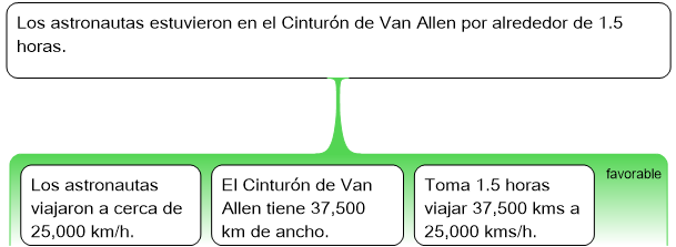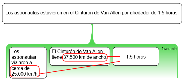 Vea la segunda premisa conjunta. Es algo relacionado con el Cinturón de Van Allen. La tesis dice que toma 1.5 horas viajar a través de él. ¿Qué hay acerca del Cinturón de Van Allen que sea relevante al tiempo que toma para viajar a través de él? Su tamaño o anchura, por supuesto. Entonces parece tener sentido que la segunda premisa conjunta nos debería decir cuán ancho es el Cinturón de Van Allen. En este momento no lo sabemos directamente. Sin embargo podemos deducirlo de las otras afirmaciones que ya conocemos: que los astronautas viajaron a 25,000 km/hr y que les tomó 1.5 horas. Un poco de matemáticas elementales revelan que el Cinturón de Van Allen deber tener 37,500 km (25,000 x 1.5) de ancho. Entonces pongámoslo en el cuadro de afirmación: