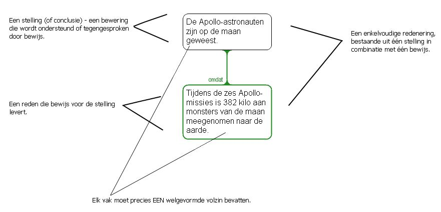 Dat is belangrijk omdat de enkelvoudige redenering de basiseenheid van het redeneren vormt. Alle redeneringen, hoe complex ook, bestaan uit aan elkaar gekoppelde enkelvoudige redeneringen. Dat zal duidelijker worden in Tutorials 3 en 4.