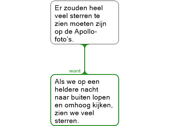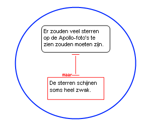 De bewering die hier wordt ondersteund is: Er zouden heel veel sterren te zien moeten zijn op de Apollo-foto’s. Het bewijs daarvoor luidt: Als we op een heldere nacht naar buiten lopen en omhoog kijken, zien we veel sterren. Van deze redenering kunnen we als volgt een schema maken: