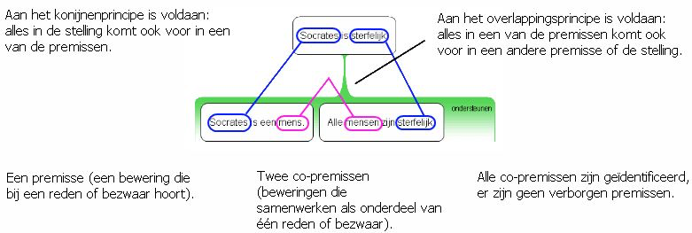 Door bij het maken van redeneerschema’s deze twee principes in gedachten te houden zorgen we ervoor dat de redeneringen goed gestructureerd zijn en dat alle belangrijke onderdelen van de redenering zijn geïdentificeerd en de juiste positie innemen.