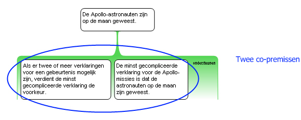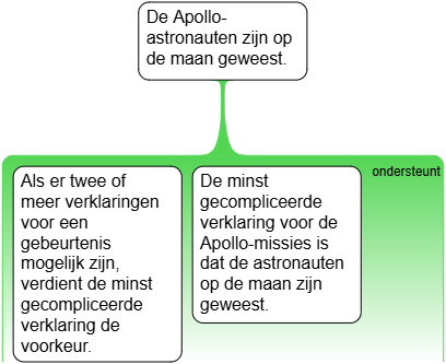 Als er twee of meer verklaringen voor een gebeurtenis mogelijk zijn, verdient de minst gecompliceerde verklaring de voorkeur. De minst gecompliceerde verklaring voor de Apollo-missies is dat de astronauten op de maan zijn geweest. Daarom zijn de Apollo-astronauten daadwerkelijk op de maan geweest. [gebaseerd op 10.4]