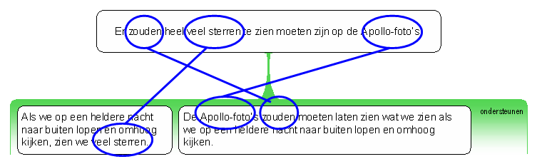 Het voornaamste is dat het schema laat zien dat de premissen bij elkaar horen en deel uitmaken van één reden of bezwaar. Bij het hier getoonde schema blijkt dit uit het groene vak waarin de premissen zijn ondergebracht. Dit groene vak kan worden beschouwd als een uitbreiding van het verband tussen de premissen en de stelling.
