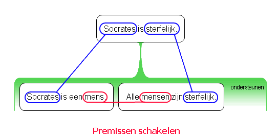 - Het Schakelprincipe: elk belangrijk woord (of groep woorden) of concept dat voorkomt in een premisse van een enkelvoudige redenering, maar niet in de stelling, moet ook voorkomen in een andere premisse van diezelfde enkelvoudige redenering.